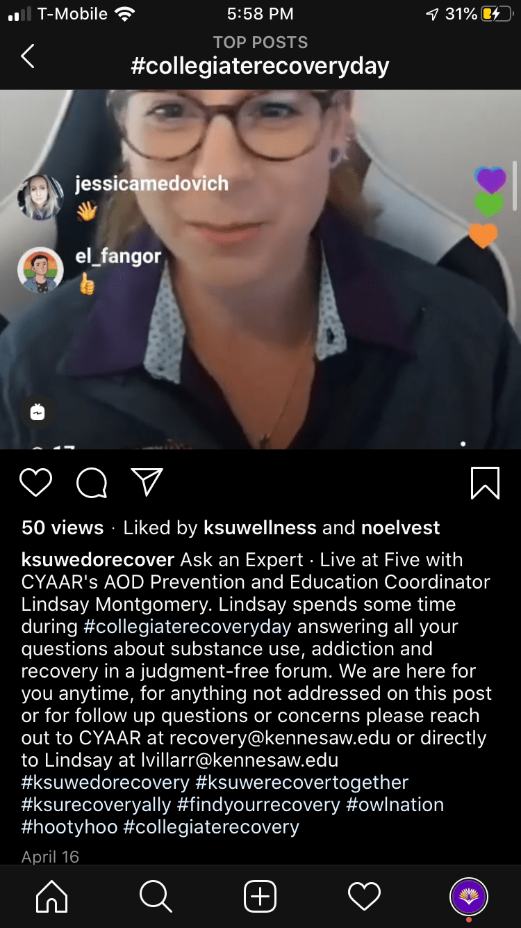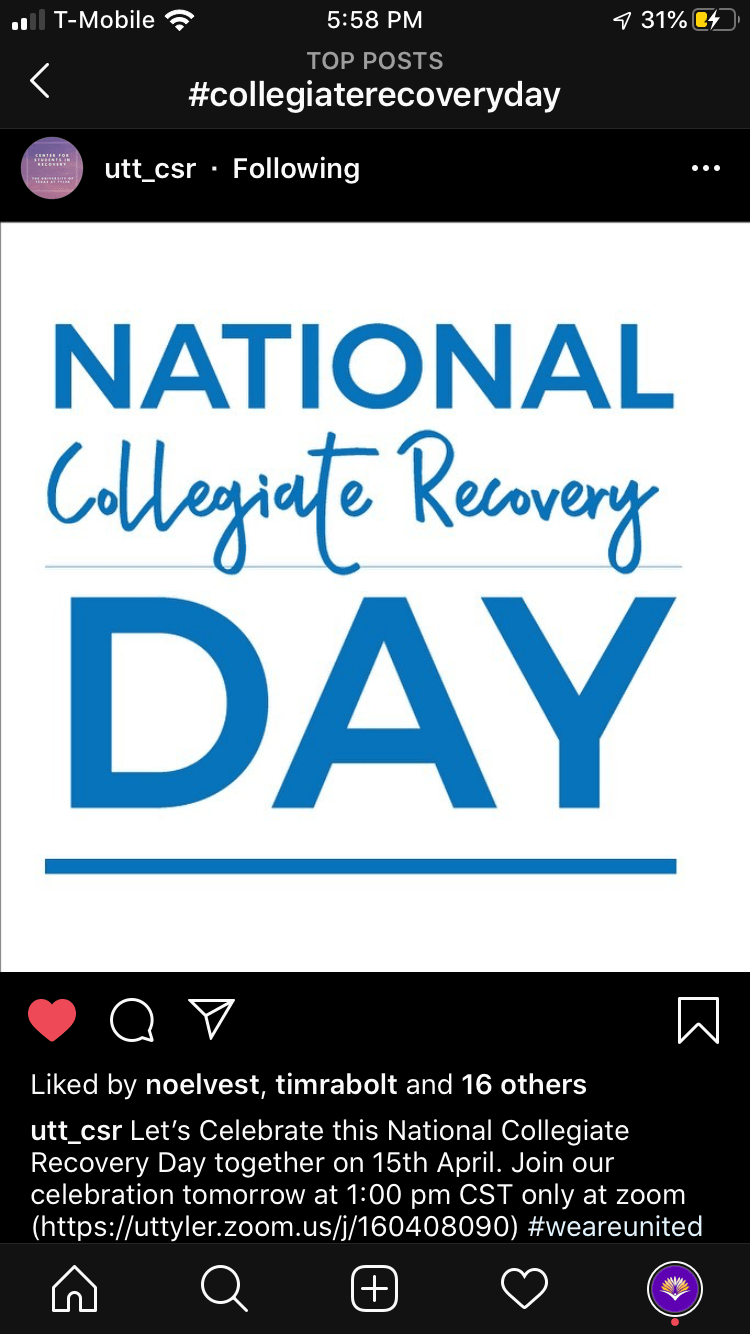 Shippensburg University and the University of Texas Tech held Zoom conferences about collegiate recovery. The University of Texas Rio Grande Valley held a recovery ally training, and the University of North Carolina hosted a webinar on Intersectionality and Recovery. Kennesaw State University held a live event where their AOD Prevention and Education Coordinator answered recovery-related questions.