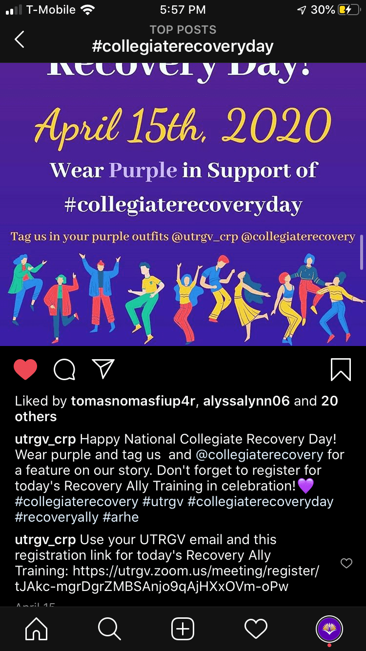 On Instagram, there were over 160 posts and the hashtag #CollegiateRecoveryDay was used in over 100 posts. Participants provided resources, shared their stories, and wore purple to show support for the collegiate recovery community.