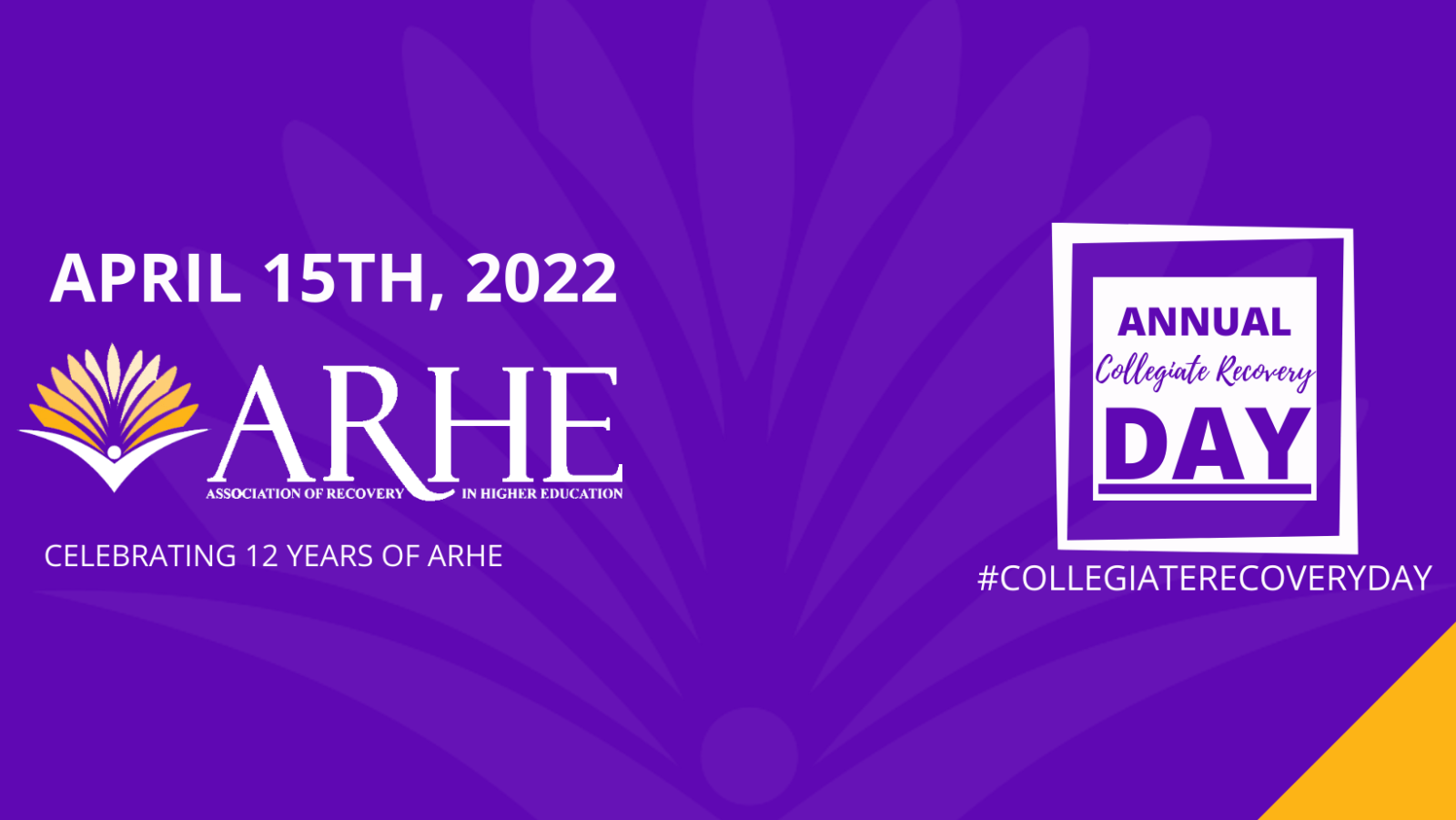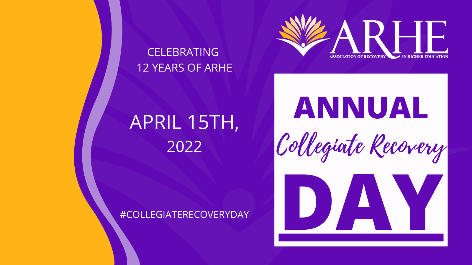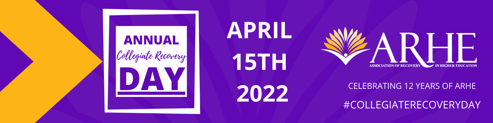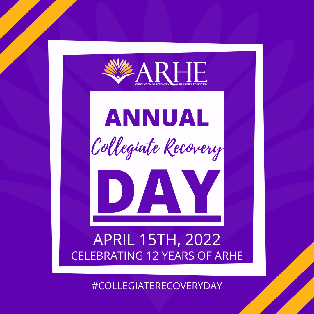 The Association of Recovery in Higher Education (ARHE) was founded on April 15, 2010 and recognizes April 15th as Collegiate Recovery Day. This year, we are celebrating Collegiate Recovery Week from April 11, 2022 – April 15, 2022. We have a variety of virtual celebrations and programming to unite the collegiate recovery field throughout the week.