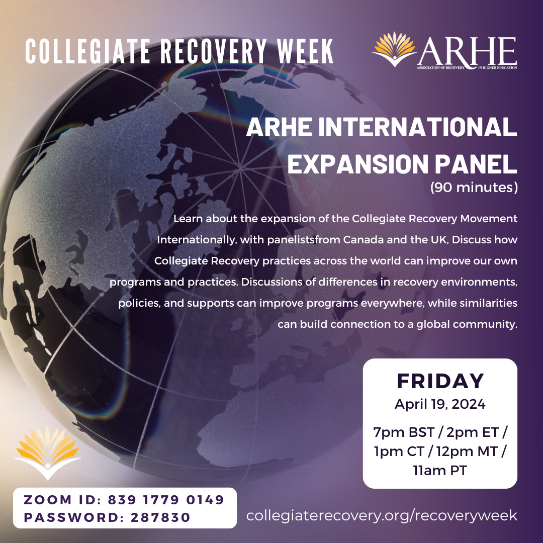 Learn about the expansion of the Collegiate Recovery movement Internationally, with panelists from Canada and the UK. Discuss how Collegiate Recovery practices across the world can improve our own programs and practices. Discussions of differences in recovery environments, policies, and supports can improve programs everywhere, while similarities can build connection to a global community.