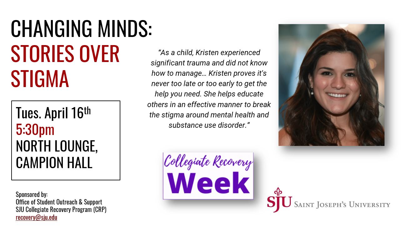 Event Description: Join us for this event celebrating Collegiate Recovery Week! Kristen will share her empowering story. ‘As a child, Kristen experienced significant trauma and did not know how to manage what she was feeling… Kristen proves it’s never too late or too early to get the help you need. She helps educate others in an effective manner to break the stigma around mental health and substance use disorder.’