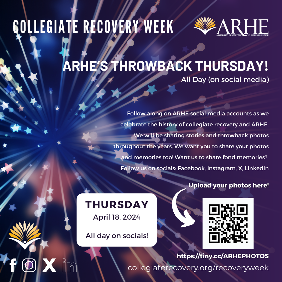 Follow along on ARHE social media accounts as we celebrate the history of collegiate recovery and ARHE. We will be sharing stories and throwback photos throughout the years. We want you to share your photos and memories too! Want us to share fond memories? Submit your photos at: https://tiny.cc/ARHEPHOTOS