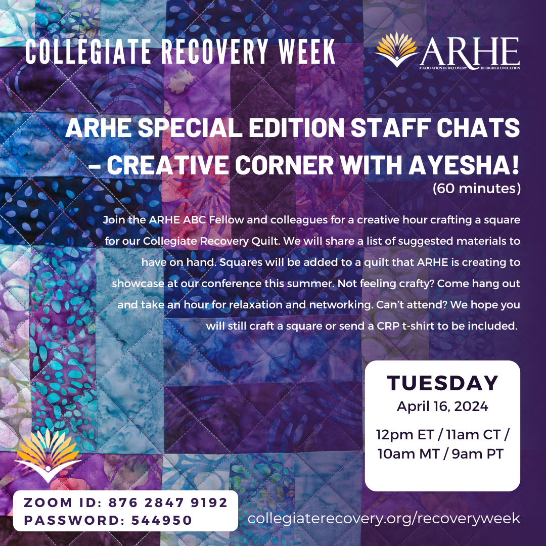 Join the ARHE ABC Fellow and colleagues for a creative hour crafting a square for our Collegiate Recovery Quilt. We will share a list of suggested materials to have on hand. Squares will be added to a quilt that ARHE is creating to showcase at our conference this summer. Not feeling crafty? Come hang out and take an hour for relaxation and networking. Can’t attend? We hope you will still craft a square or send a CRP t-shirt to be included.