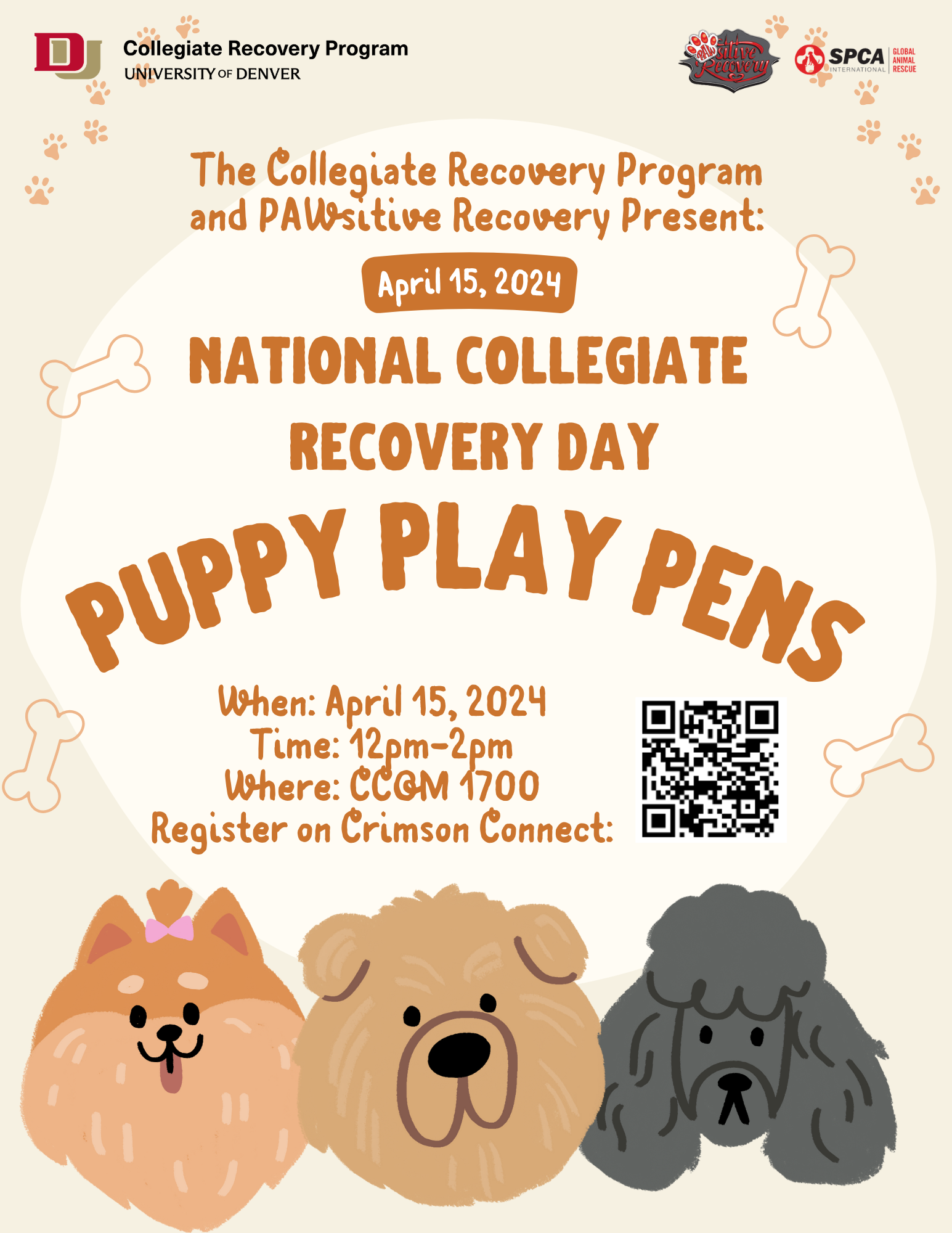 Event Description: Join the Collegiate Recovery Program in celebrating National Collegiate Recovery Week with puppy play pens in CCOM 1700 from 12:00pm-2:00pm on April 15, 2024. This event is in partnership with PAWsitive Recovery, an organization that gives people in recovery and animals in shelters a new “leash” on life, helping them heal from the wounds of addiction, trauma, and abuse. They offer: Temporary Pet Foster Care for Individuals Seeking Treatment or those recovering from Domestic Violence; Pet Visits for People in Treatment Centers and Shelters; Volunteer/Community Service Opportunities at Shelters for those in Recovery or Healing from Domestic Violence; Animal Focused Therapy in Treatment Centers and Shelters; Animal Focused Workshops in Treatment Centers and Shelters. This event will give students the chance to identify what recovery means to them and play with puppies for mental wellness.
