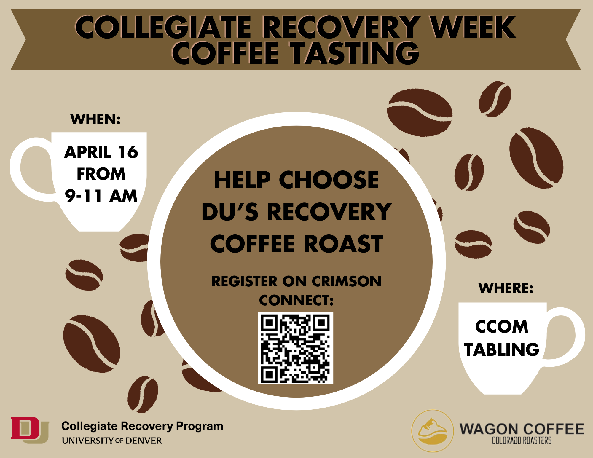 Event Description: Please join the DU Collegiate Recovery Program in voting on the DU CRP Recovery Coffee Roast. This tabling event will include free coffee sampling and recovery education with Wagon Coffee Roasters, a women-owned and operated coffee roaster supporting individuals in recovery.
