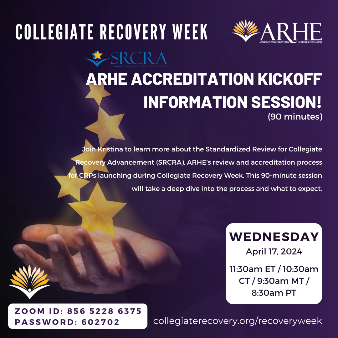 Join Kristina to learn more about the Standardized Review for Collegiate Recovery Advancement (SRCRA), ARHE’s review and accreditation process for CRPs launching during Collegiate Recovery Week. This 90-minute session will take a deep dive into the process and what to expect.